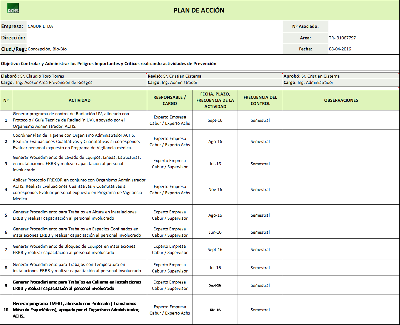 Una vez elaborada la Matriz de Identificación de Peligros, se debe realizar un plan de acción para concretar y planificar las actividades de control emanadas de esta evaluación, estipulando que niveles de riesgo se abordarán a corto plazo.