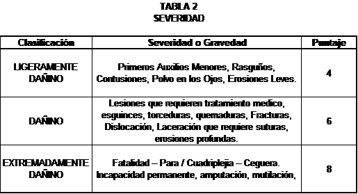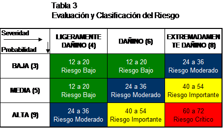 La evaluación y clasificación del riesgo, se realiza multiplicando los valores asignados a los criterios de la probabilidad de ocurrencia del peligro por la severidad de la lesión o enfermedad de la tarea.